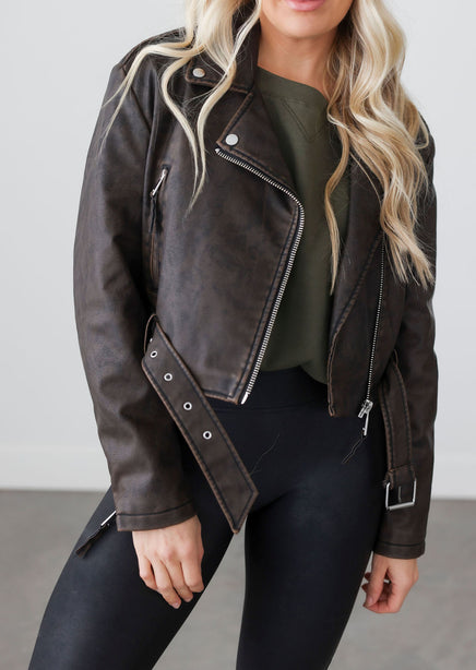 Stay stylish in the Akira Moto Jacket by Lily & Lottie. This jacket features a waistline length, an oversized collared neckline, a belted waistband detail, side zipper pockets, and an assymmetrical zip front closure. With its classic silhouette and modern touches, keep your look on-trend and confident all season long.