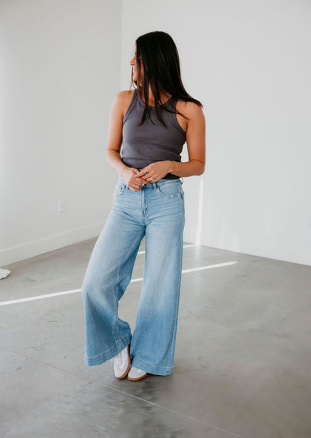 The Dolly Tank by Lily and Lottie features a high-quality ribbed knit and a comfortable rounded neckline. It also boasts a built-in shelf bra, providing an extra layer of support and allowing you to skip a step when getting ready. The tank is designed to sit right above the waistline for a flattering, flattering fit.