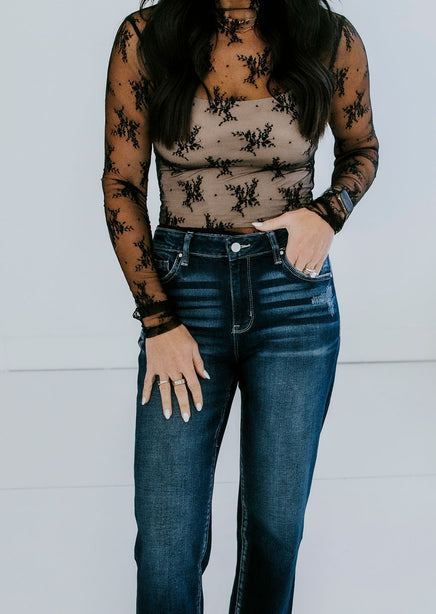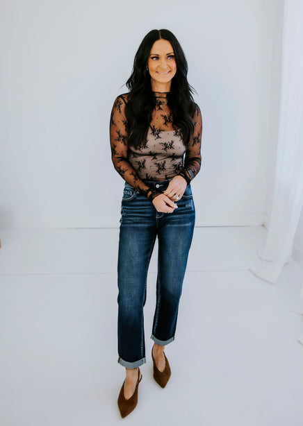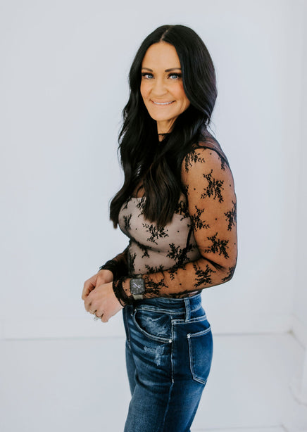 This Ember Floral Mesh Top combines a delicate mesh lace fabric with an elegant floral pattern for a sophisticated and feminine look. The long sleeve design and mock neckline. Undergarments not included. Laurie is wearing a size small.