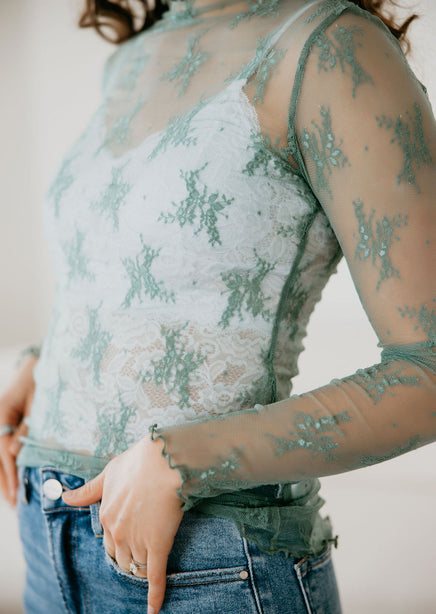 This Ember Floral Mesh Top combines a delicate mesh lace fabric with an elegant floral pattern for a sophisticated and feminine look. The long sleeve design and mock neckline. Undergarments not included. Trinity is wearing a size small.