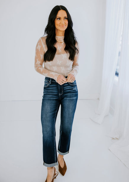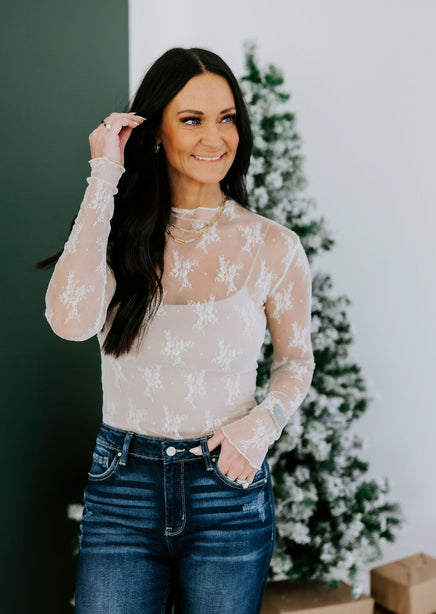 This Ember Floral Mesh Top combines a delicate mesh lace fabric with an elegant floral pattern for a sophisticated and feminine look. The long sleeve design and mock neckline. Undergarments not included. Laurie is wearing a size small.