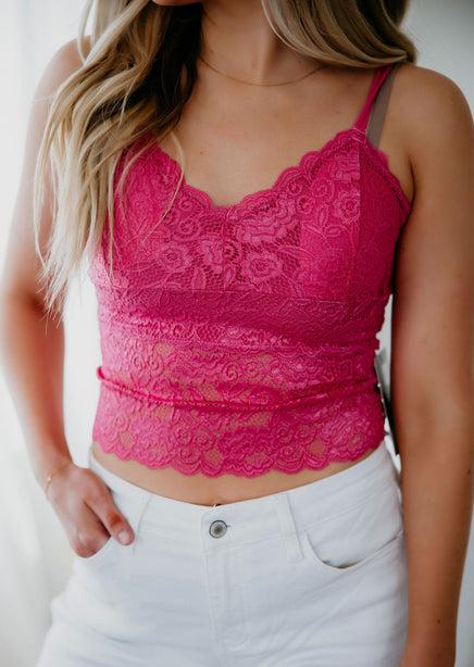 The Etta Lace Bralette boasts a dual-string strap design and all-over lace trim for a sleek and stylish look. With added padding for comfortable support and sheer lace bottom finishing, this bralette offers both form and function.