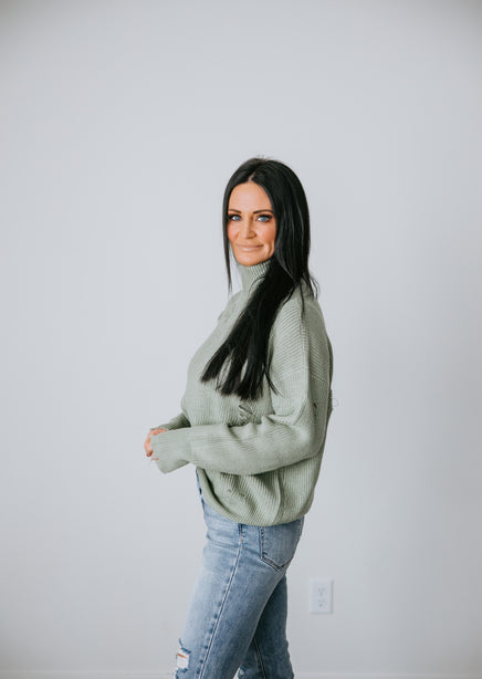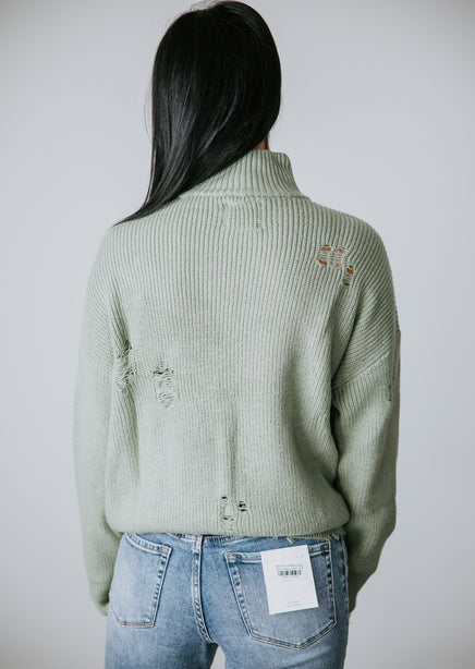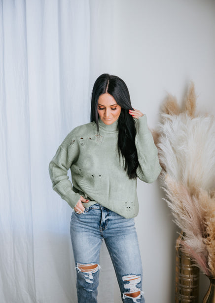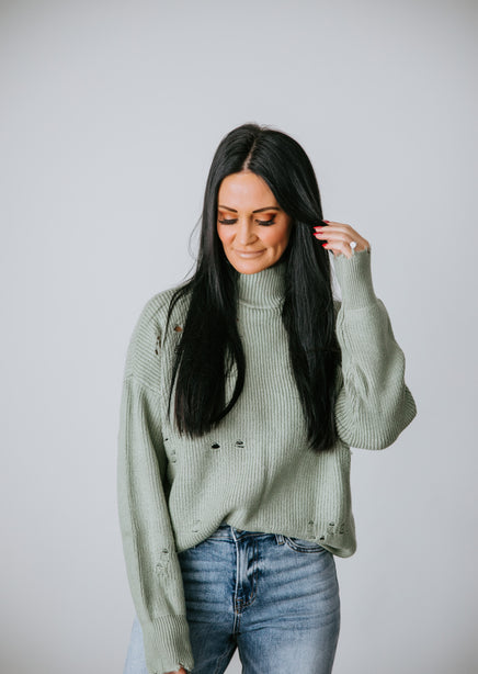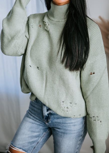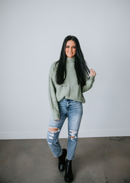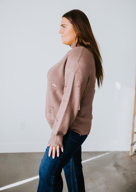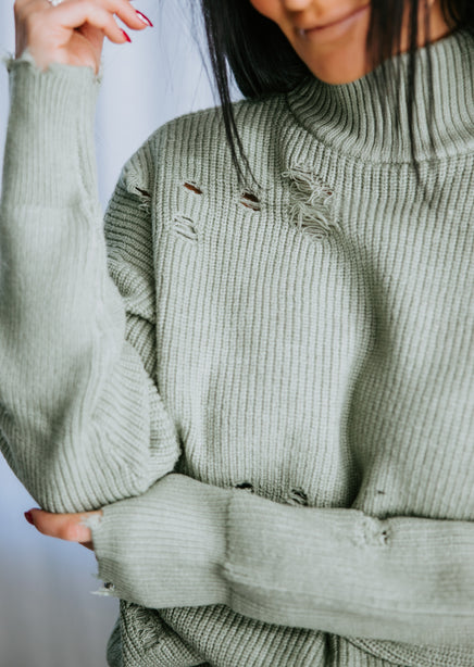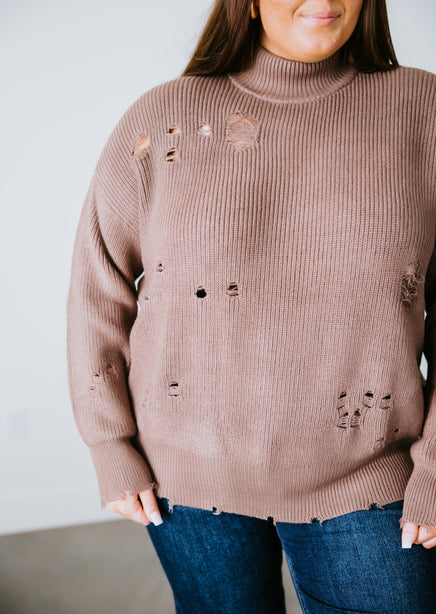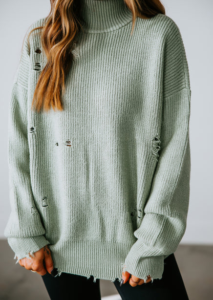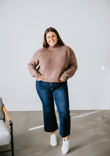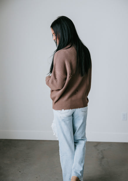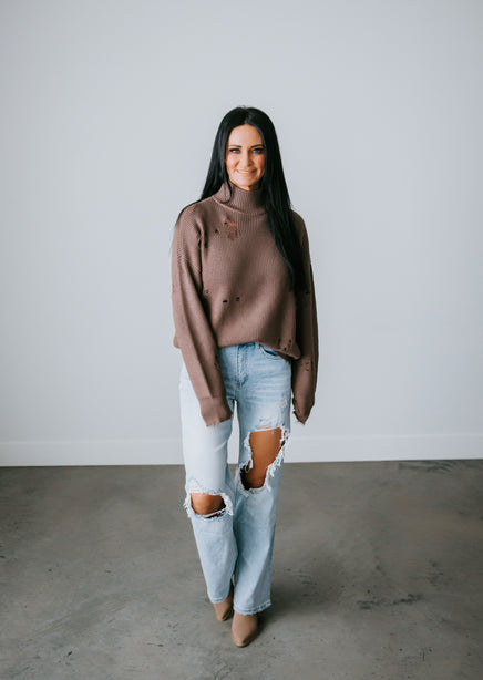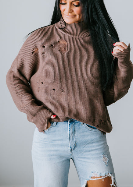 You'll adore the love-worn look of this Lauriebelles exclusive! Play it cool with the updated design of this sweater that brings a relaxed vibe to your everyday wardrobe. Pullover styling is shaped by inside-out knit and features exposed seam detailing and distressing throughout. Designed with a flattering mock neck, dropped shoulders, and long fitted cuffs. The boxy, oversized silhouette is finished with a ribbed hem. This sweater is so comfy you'll want to live in it! Pair with a brami and high-waisted jeans for an effortlessly pulled-together look. Due to the distressing process, each garment is unique.