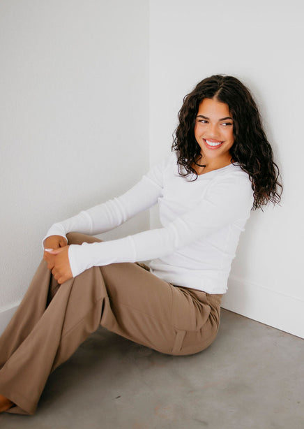 Upgrade your collection of basics with this soft long sleeve top! Once you put this on and see how wonderful it feels, you will want to get it in every color! Features a crew neck and ribbed long sleeves. Lightweight fabrication makes this top perfect for layering. Destined to be one of your go-to faves! Whether she's worn alone or layered under a slip dress this top is seriously cute! This beyond-basic tee starts with a stretchy knit construction, complete with ribbed accents at the sleeves and neckline.