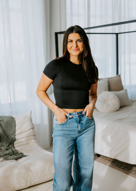 Ultra-stretchy styles that form to your body for a perfect-for-you fit. A new addition to your favorite seamless collection, this ultra-soft tee is featured in a slim-fitting silhouette with a crew neckline and cap-inspired sleeves. Madison is wearing a size S-M.