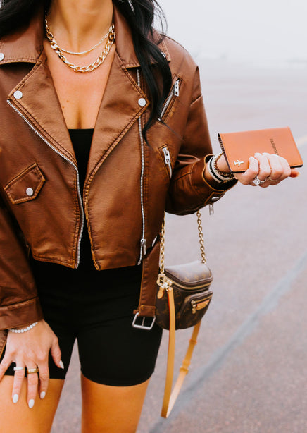 Expertly crafted for the modern trendsetter, the Outlaw Brown Moto by Lily and Lottie offers a stylish blend of edginess and sophistication. With a cropped length and oversized lapels, this moto jacket boasts an asymmetrical zip front and buckle detail at the waistband for a bold and rebellious look. Zipper details throughout add a touch of functionality to this statement piece.
