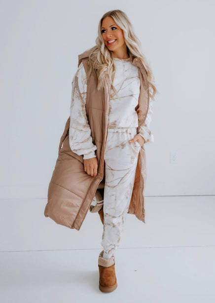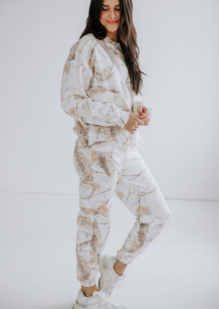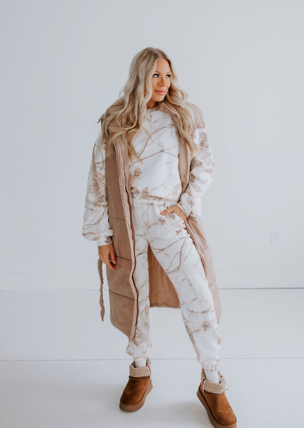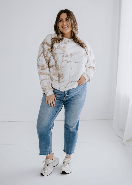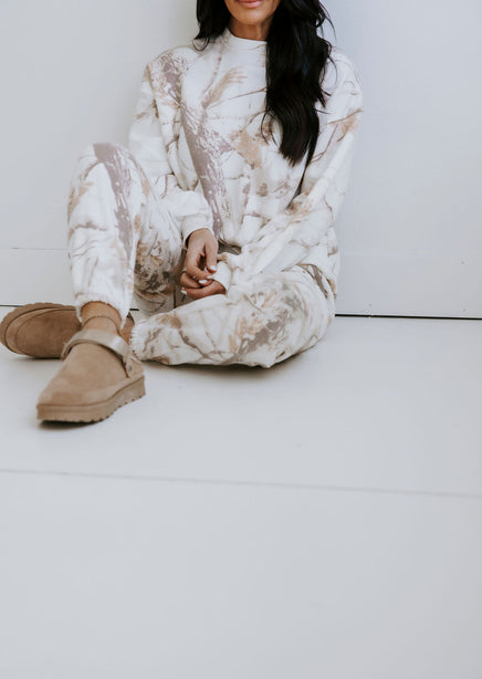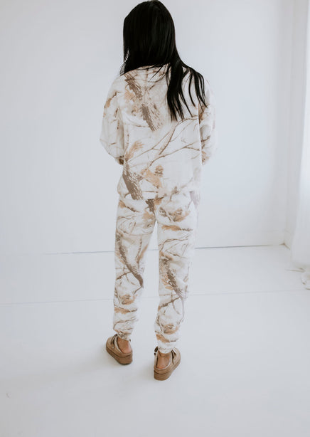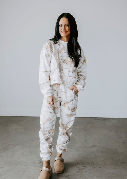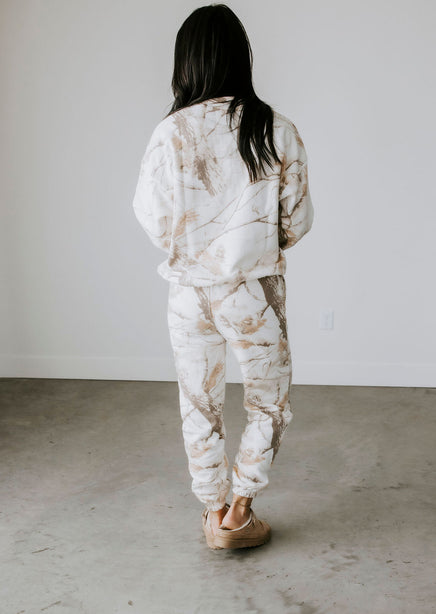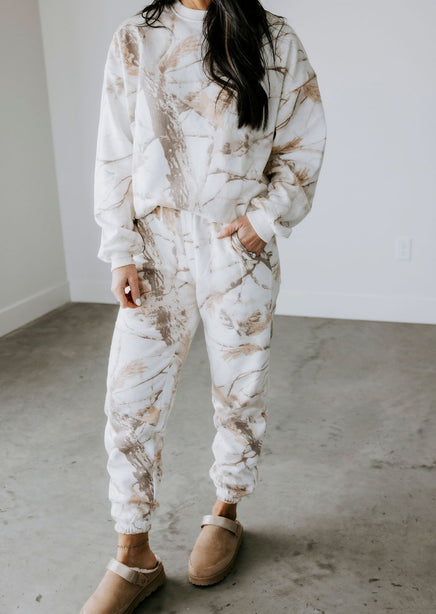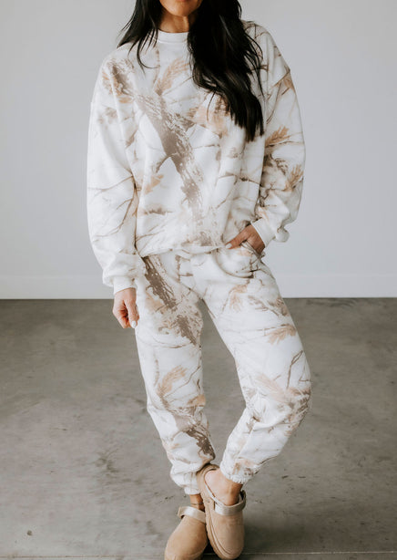 Stay warm and stylish with the Sand Dune Camo Crew by Lily & Lottie. This crew features a unique branch and leaves camo pattern, along with a cozy interior fleece lining. The relaxed fit, crew neckline, and long sleeves make this a must-have for any adventure. Pair with the Sand Dune Camo Joggers for a matching outfit!
