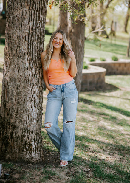 Expertly crafted by Lily & Lottie, the Tessa Eyelet Tank offers a semi-fitted design, while the thick straps provide comfort and support. The front features intricate eyelet hole details, adding a touch of charm to this ribbed tank. Perfect for everyday wear with a hint of elegance.