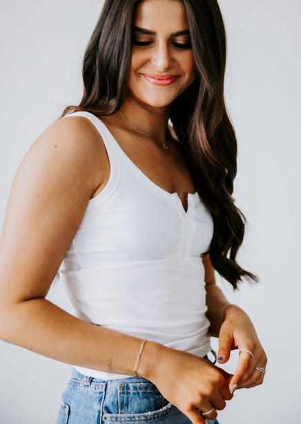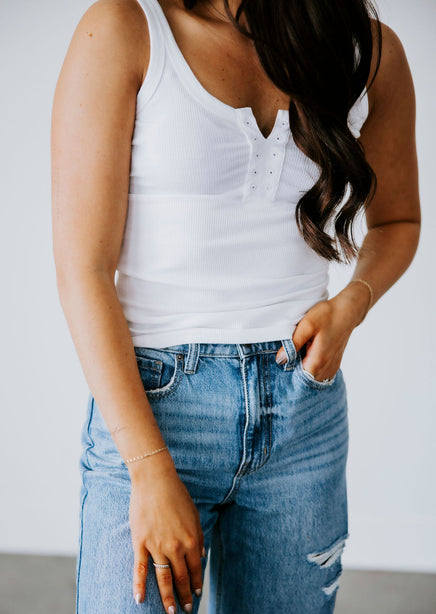 Expertly crafted by Lily & Lottie, the Tessa Eyelet Tank offers a semi-fitted design, while the thick straps provide comfort and support. The front features intricate eyelet hole details, adding a touch of charm to this ribbed tank. Perfect for everyday wear with a hint of elegance.
